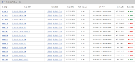 上述产品按AC份额计算,实际是13只,李丹任期内9只盈利、4只亏损,其中回报最高的是国寿安保稳嘉混合A,收益率39.53%,回报最低的是国寿安保裕祥混合A,收益率-8.3%。