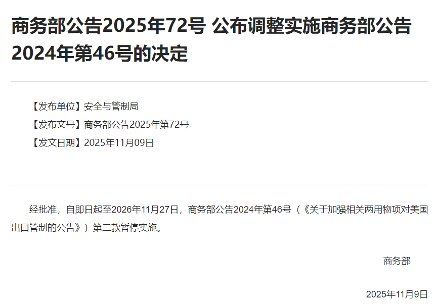 商务部发布公告:中方暂停对美两用物项出口管制部分措施。