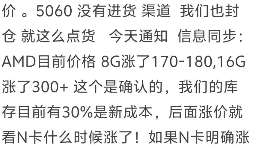 但没想到行情变化的这么快,短短几天渠道报价就已经上调成本了,工厂开始减少出货,部分型号甚至直接无货可供(5060、5070),AMD跟英伟达都有上涨的想法,跟之前的说法一样,显存越大涨的越多,而且涨幅比想象的大: