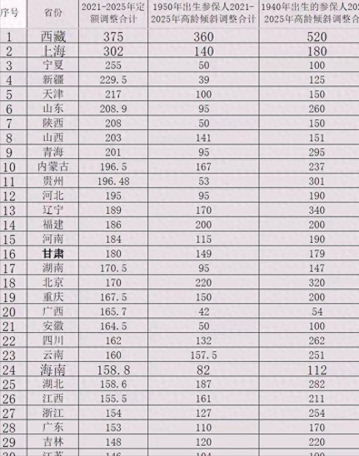 从表中的数据可以看出,近五年养老金定额调整标准最高的是西藏,西藏由于地理位置比较特殊,再加上是高海拔地区,艰苦边远地区,人口基数比较低,退休人员的数量有限,没有多少可比性。